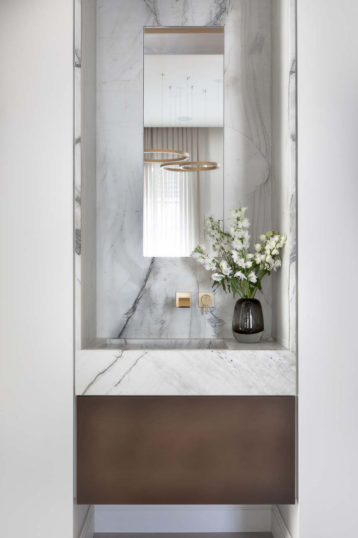 Located in Jerusalem’s historic Baka neighborhood, this one-floor garden apartment brings the elegance of Art Deco design to life within a lush, natural setting. The home’s 3.5-meter ceilings and refined proportions evoke the airiness of a Parisian loft-graceful, sophisticated, and effortlessly chic. Every element was designed with Art Deco precision: the interior doors, curves, and geometric lines reflect the glamour of the period while maintaining a contemporary softness. Marble inlaid floors flow through the space, leading to bathrooms clad entirely in marble with brass fixtures that shimmer under natural light.